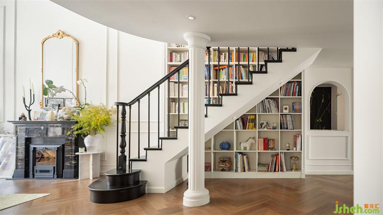 基于業(yè)主巨量藏書的要求,我們設(shè)計了貫通一二樓的整面書架墻,書架旁的直樓梯既是上下之用,也常被大小男主人用作閱讀坐處,符合他們關(guān)于隨處閱讀的美好想象。裝修設(shè)計樓梯一樓扶手設(shè)計的蝸牛彎、第一二級階梯做成的弧形、形成側(cè)向的轉(zhuǎn)向,處處蘊含法式細節(jié),也響應(yīng)了樓梯在風水方面的要求。另外把樓梯做深,更能體現(xiàn)書的立體感和存在感,樓板支撐柱則采用羅馬柱的形式進行了包裹裝飾。