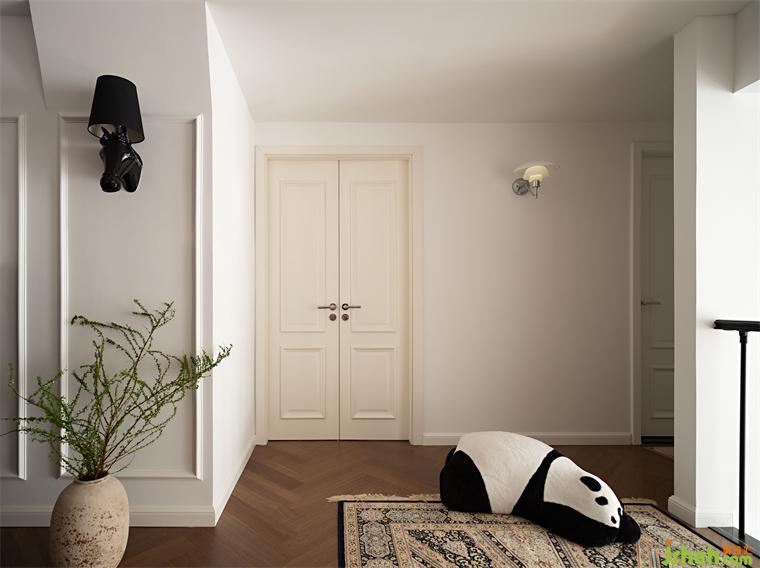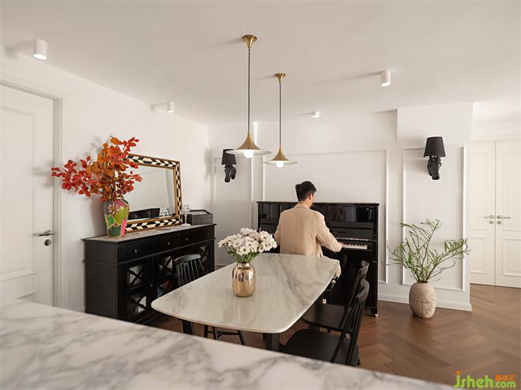 活動區(qū)的墻面為了應(yīng)襯鋼琴演奏的氛圍感,加了一圈簡單的線條,搭配有黑色的馬頭壁燈,以及法式元素的壁畫和邊柜。