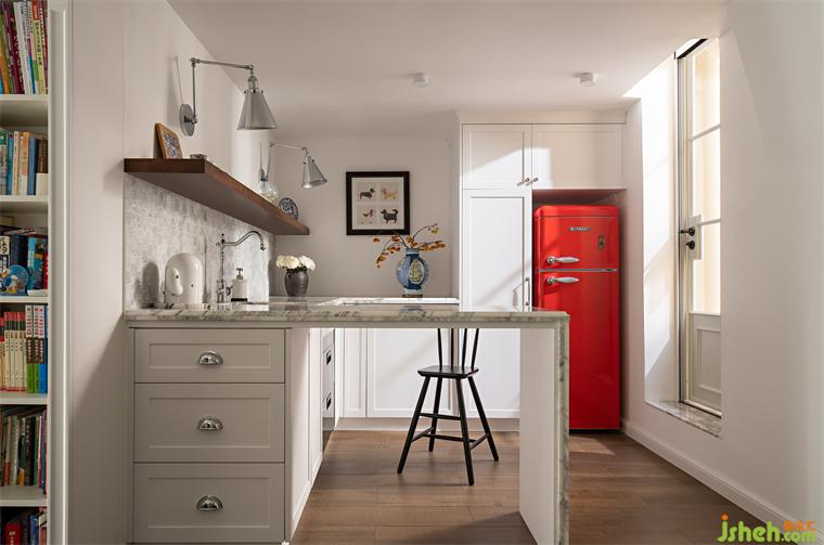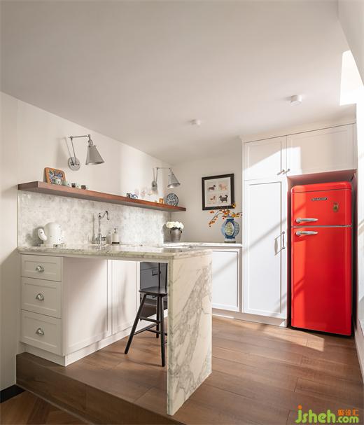 這里最為點亮空間的便是紅色的復(fù)古冰箱,讓人的視覺情不自禁被它吸引,廣州復(fù)式設(shè)計在素色的櫥柜中給予一抹熱情的點綴。櫥柜部分則繼續(xù)沿用了樓下的雪花白大理石元素,臺上的裝飾,讓人更多的感受到這是一個放松的空間。