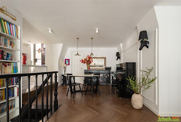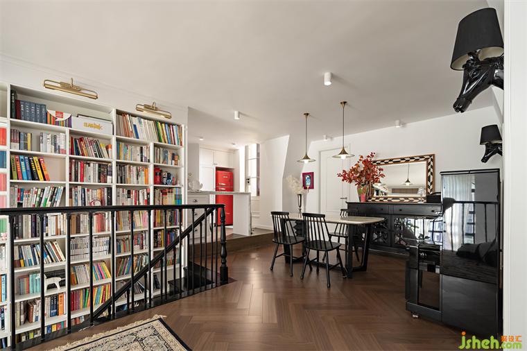 書房設(shè)置在二樓樓梯口的位置,結(jié)合旁邊樓梯中空位置的書墻,形成這套房子非常標識性的一個開放式書房,更多的是父母為小孩輔導作業(yè)的功能,滿滿的圖書館氛圍感。