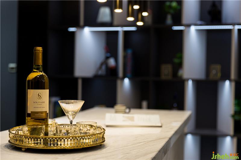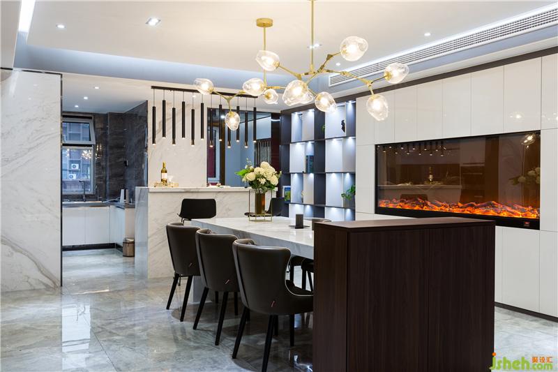 餐廳的整體色調(diào)基本與客廳協(xié)調(diào)統(tǒng)一,背景墻區(qū)域同樣是采用大面積的白色,亮點之處則是以溫暖的壁爐作為視覺中心,木質(zhì)的餐邊柜與大理石質(zhì)感的餐桌相互協(xié)調(diào),線條流暢簡單,空間色彩上更為活潑、生動。餐邊柜的區(qū)域設(shè)計的吧臺,便于男女主人平日里小酌,也更多了些慵懶放松感,暖光直接投射于餐桌的金屬餐具之上,體現(xiàn)出一種精致高貴的生活環(huán)境。室內(nèi)設(shè)計師