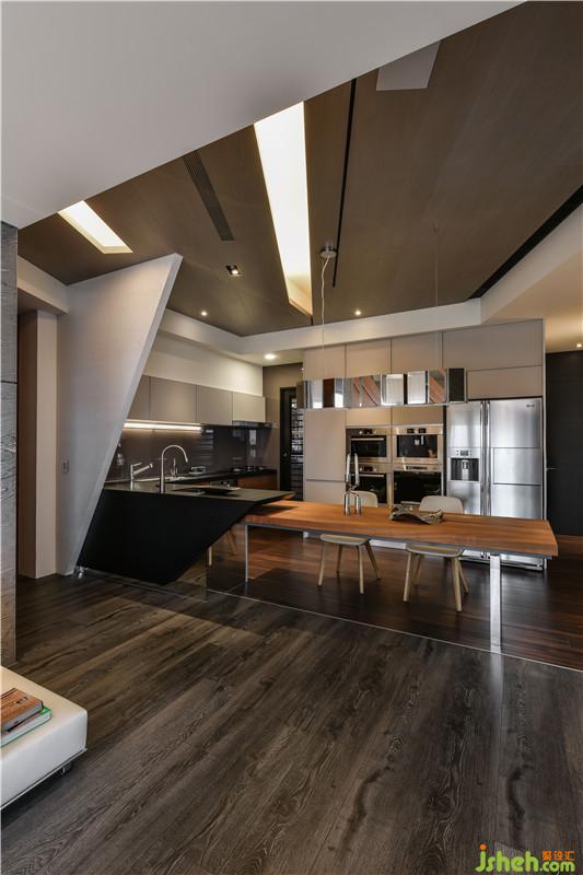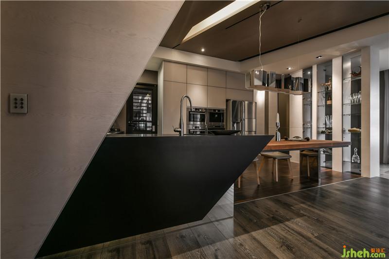 懸浮的餐桌量體,以精密的計算鑲嵌于造型吧臺中,讓餐櫥空間成為一系列流動線條的延續(xù),放大了整體的空間感;配色、材質(zhì)與造型的相互搭配,結(jié)合了展示、收納、起居與創(chuàng)造性的空間關系,亦為屋內(nèi)迎來了各種超現(xiàn)實色彩的重力感受。藉由曲度、折線、面材對比,打造出具有流動感與故事性的居家空間。