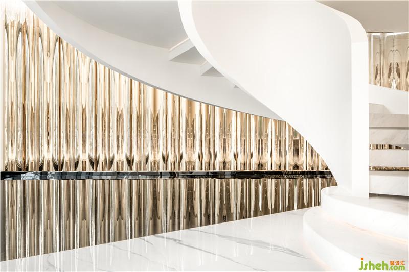 大廳借由自然光線(xiàn)和建筑線(xiàn)條的鋪層,提煉空間結(jié)構(gòu),與金屬材質(zhì)造型的豐富層次,幻化出光的場(chǎng)域。讓人置身其中,一步一景色,俯拾之間即見(jiàn)日月星辰。利用光影照度,把控空間的節(jié)奏和溫度。靈動(dòng)的線(xiàn)條仿佛漂浮的流云,在鋼筋水泥之外呈現(xiàn)翩躚云上的意境。裝修公司