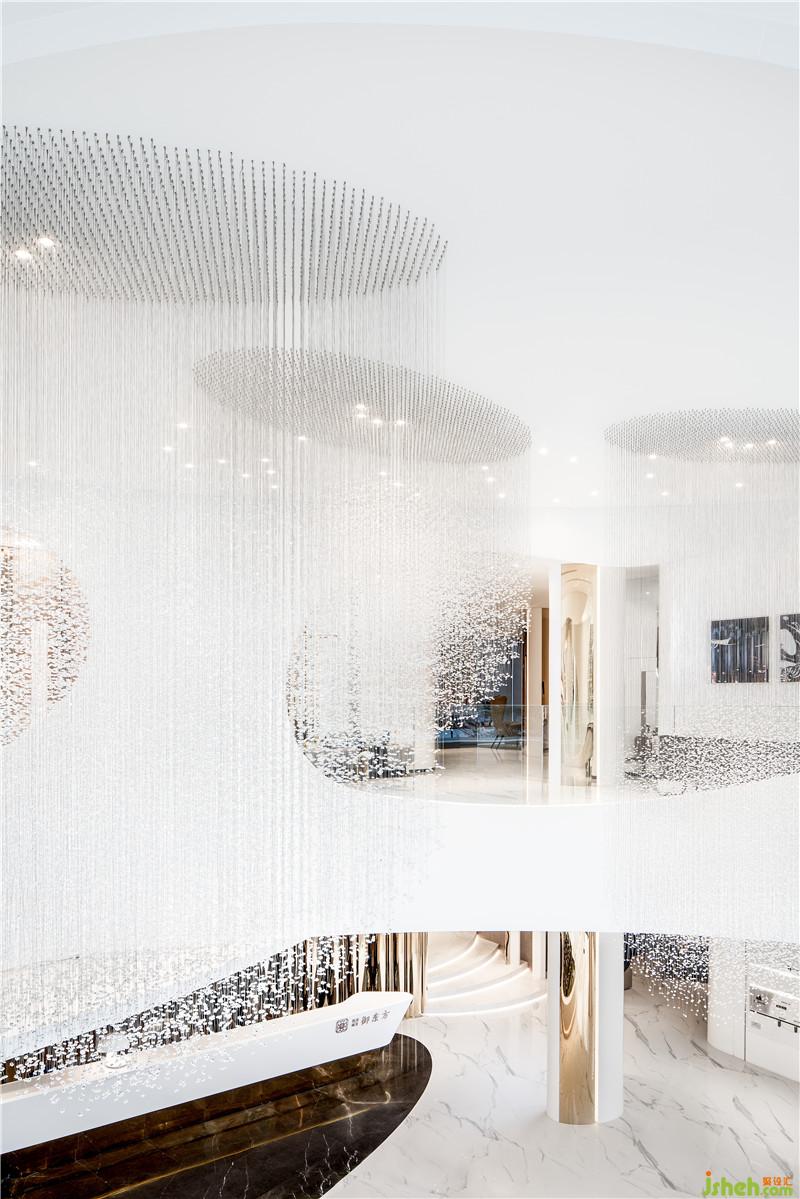 高空緩緩垂下幾盞帷幔燈飾,與星空下的呼應(yīng),璨若星辰,如璀璨的星光劃破時(shí)空,定格優(yōu)雅光影中的世界,與幕墻的金屬的光澤透露東方美學(xué)智慧。如水自由、如云悠然,向往亦真似幻地成為空間的隱喻,開(kāi)啟美好生活哲學(xué)的追隨。每一個(gè)當(dāng)下,都向往著月與星辰的未來(lái)。掬水在手即可見(jiàn)云上流光。