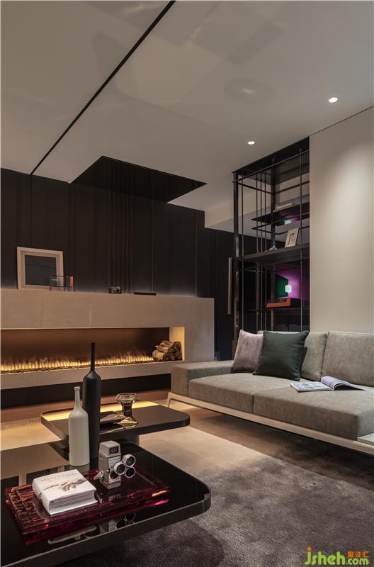 沙發(fā)與茶幾,配合著光影與色彩的搭配,組合成一幅現(xiàn)代主義的圖景,長條矩形的壁爐跳躍著溫暖明媚的火焰,讓時(shí)間變得明媚,幻化成夜空中最亮的星。