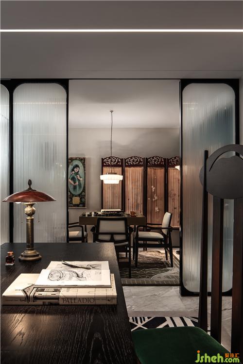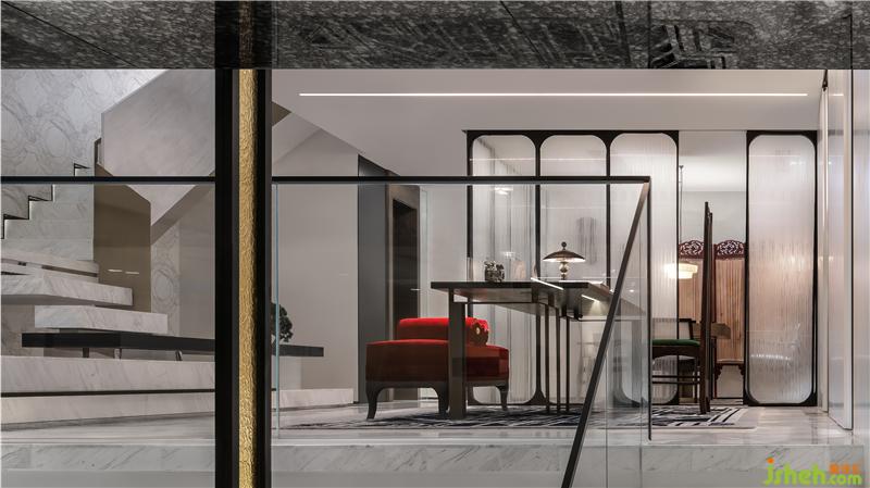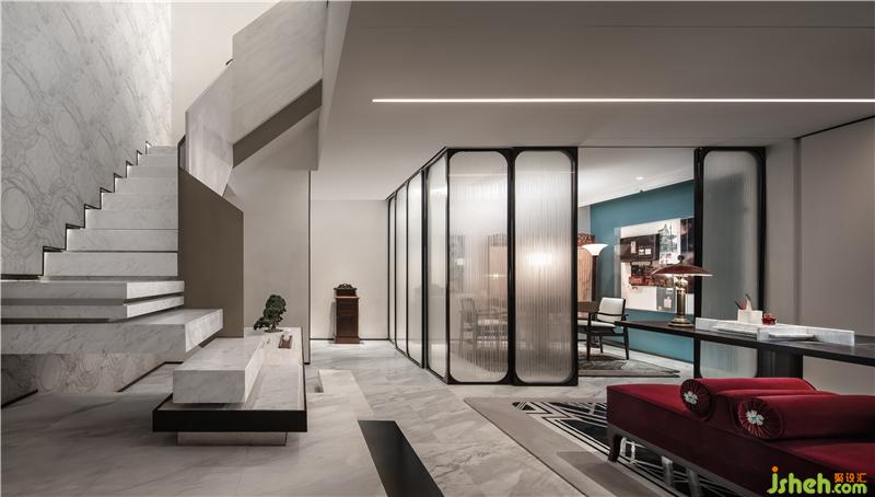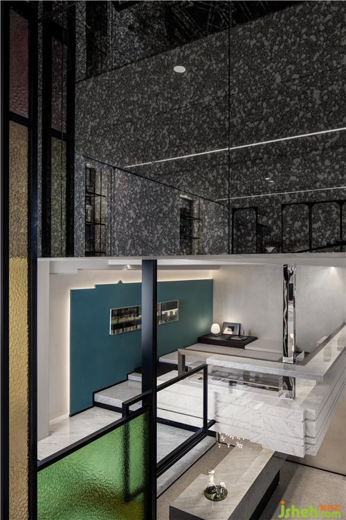 簡潔抽象的集合體組合成舒展有序、起伏變化的形體。穿越至民國往日那些錯錯落落的屋檐、窗欞之中,每一步皆在歲月中行走。頗具藝術(shù)感的的旋感樓梯作為媒介,以豐富的角色、精彩的形式和精湛的工藝,傳遞出民國風(fēng)最典型、最深層的標簽和精神??臻g層次錯落,猶如微縮的Art Deco摩天建筑群。與彩色鐵藝玻璃屏風(fēng)、白色石材馬賽克地板,以及臺階內(nèi)嵌的黃銅,共同形成一種優(yōu)雅又傲慢的氣氛。