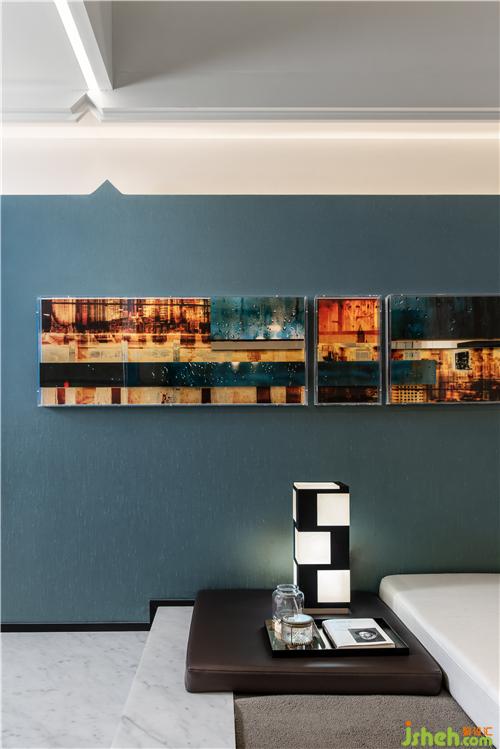 盛行于民國時期的水紋玻璃,如流動的水瀑般傾瀉而下,炙白與冰藍交互,淡粉與淺綠言和,如閃爍于舊上海的霓虹,將繁華記憶凝固于此,為整體空間營造朦朧清透的美感。虛無的白,湛澈的海,空間的界限被消解,現(xiàn)實世界與夢幻空間漸次模糊。