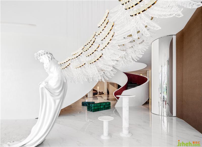 曠遠的空間內(nèi)天使降臨,矩陣式燈帶自空中垂直而下如天使綻開的雙翼,感性的溫度柔化理性的空間,為宇宙浩瀚的詩意闡發(fā)出無限哲思,讓藝術(shù)的力量豐盈空間氣韻。突破次元的超現(xiàn)實感,一如《三體》文明中地球人夢境與潛意識的畫面拼貼,透凈且流暢的空間形態(tài),構(gòu)成超現(xiàn)實的錯置感,步入其中內(nèi)心奇妙卻安定。仿佛唯有柔美靈動的力量,方可撼動堅硬的鋼筋混泥土。