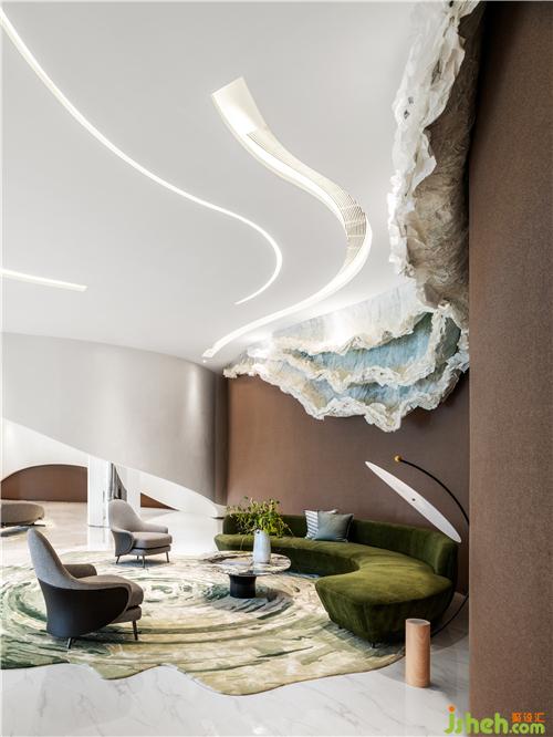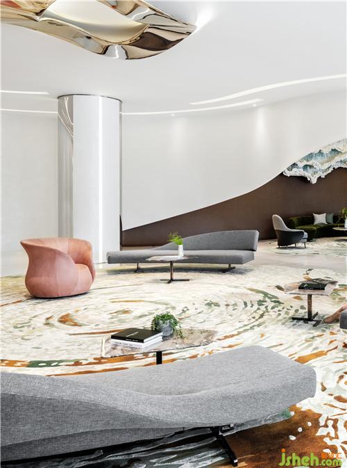 無規(guī)則綠紋地毯如池塘微動,在澄凈白練的空間變化出水波漾漾的虛空幻境。幾只橡皮粉鹿皮絨單人椅,如似開未綻的朵朵粉荷立于水塘之上。布藝灰色長條沙發(fā),如洗練的石塊靜靜匍匐于荷塘水面。一高一矮與空間形成微妙的對話關(guān)系,又如一塵未沾的未來世界,夢幻而又充滿現(xiàn)實感。