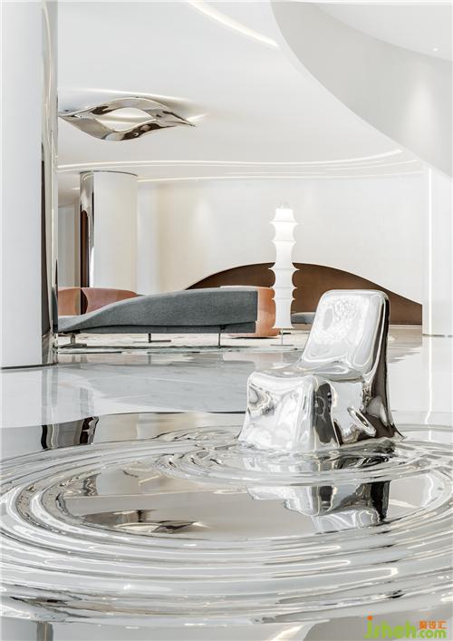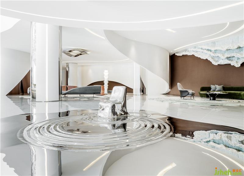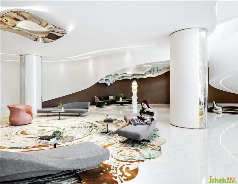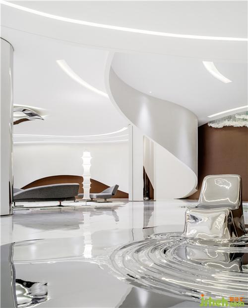 踏入洽談區(qū),時間靜止的魔力撲面而來,以「宇宙:引力、自轉(zhuǎn)、公轉(zhuǎn)」為設(shè)計主軸的美學(xué)闊值,引出杭州水脈形上的玄想,藉由想象創(chuàng)造一個擁有無限可能的空間。