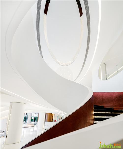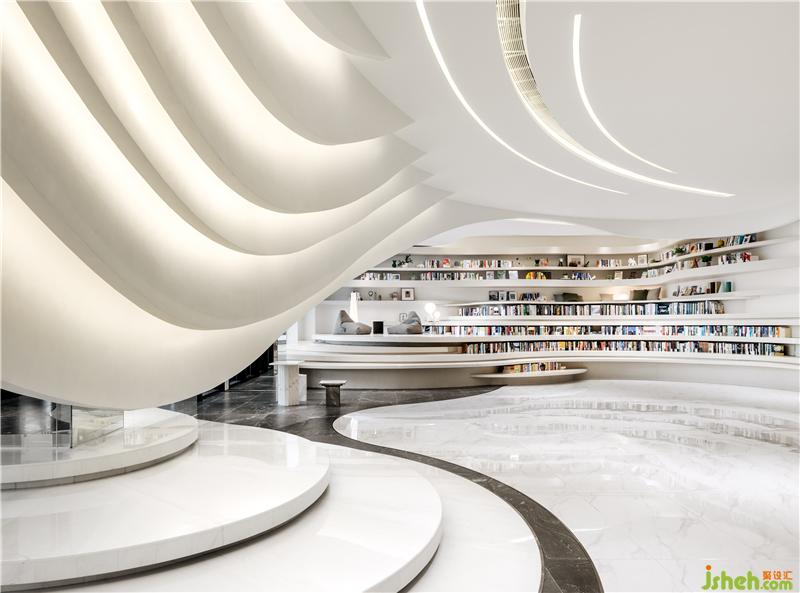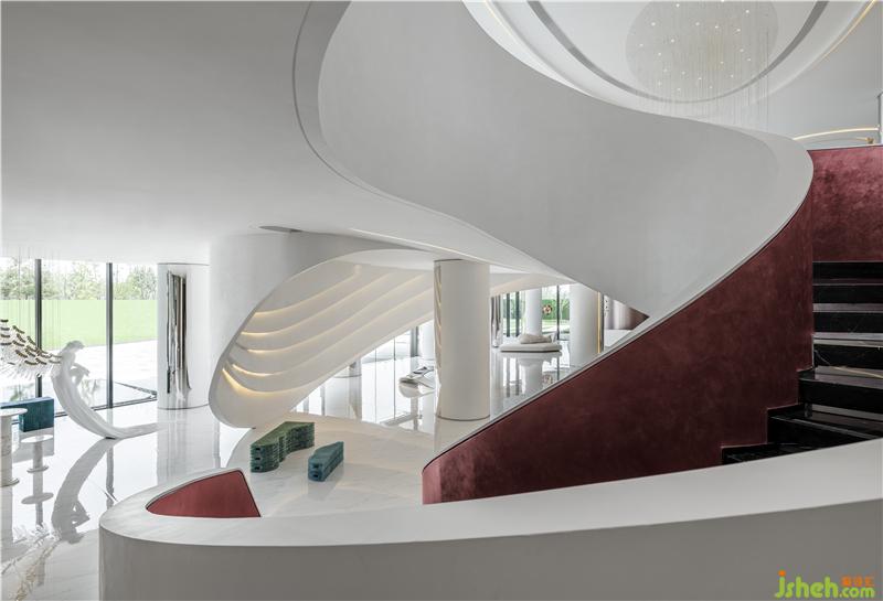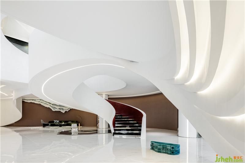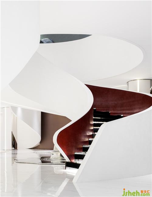 樓梯下方消融裝置單人椅,以不銹鋼拋光技術(shù)處理,如同人類的足跡與冰川消融間不可逆的對立關(guān)系。杭州售樓處設(shè)計探討生活哲學(xué)的內(nèi)涵,亦呼喚對自然的反思?;⌒螏缀嗡囆g(shù)裝置,如融化的浮冰,又如人生的孤島,超現(xiàn)實主義的藝術(shù)構(gòu)思,與整體空間形成呼應(yīng),成就空間的鏡像效果。