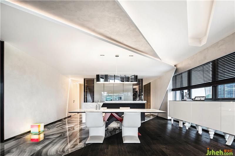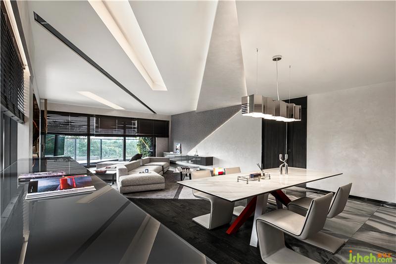 頂部天花板通體的白色飾面,借幾何切割的燈槽打破單一的設(shè)計結(jié)構(gòu),燈帶的介入放大明暗多變的視覺層次,突破空間的束縛感,讓物質(zhì)與精神間的跨域,恰好呼應(yīng)著主人的藝術(shù)偏好。