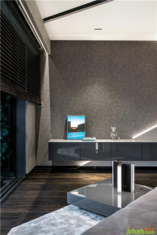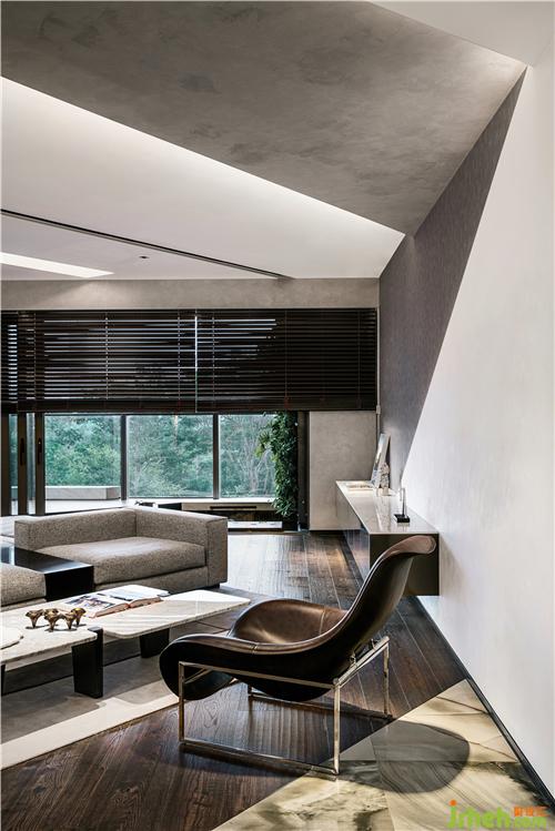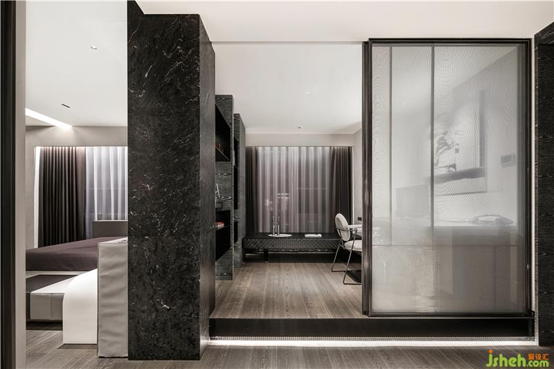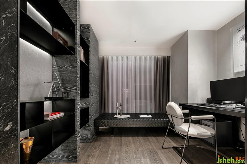 紗紋移門隱隱綽綽的設(shè)計(jì),若隱若現(xiàn)為臥室分立出一塊獨(dú)立的書房空間,色調(diào)高級(jí)的黑色大理石與仿木紋飾面、淺灰色布藝組合,深圳豪宅設(shè)計(jì)氤氳一處極具藝術(shù)氣息的場(chǎng)域.