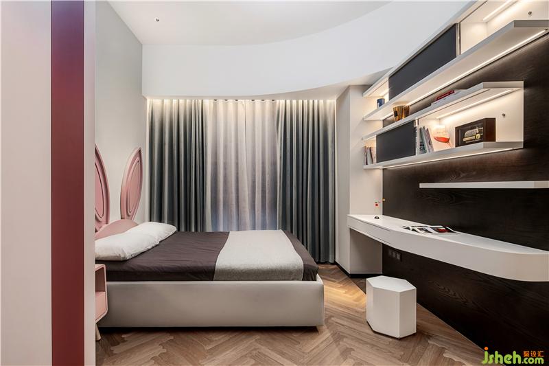 女孩房?jī)?nèi),盈白的安逸世界里,漸入浪漫的藕粉色,并以兔耳作床靠裝飾,深圳豪宅設(shè)計(jì)浸潤(rùn)出極具藝術(shù)氣息的童真空間。曲線勾勒天花板的別樣趣味與藝術(shù)格調(diào),懸浮書柜烘托起盈盈的休憩氛圍。