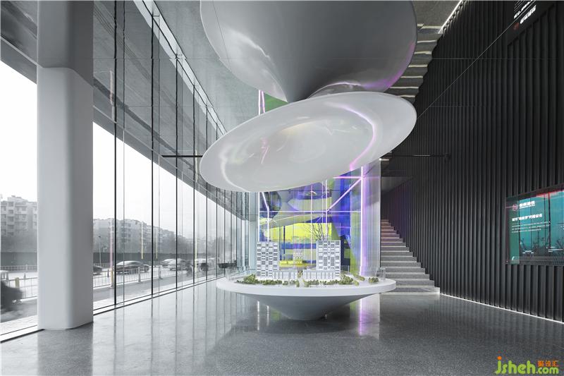 不規(guī)則地毯映畫霓虹萬丈、流光溢彩,柔軟的質(zhì)感輔之以科技感十足的城市光影,好似游走在繁華夜幕。游動、穿透、韻律相依存,極具層次的軟裝陳設(shè),充滿未來感的設(shè)計語言,勾勒出兼富節(jié)奏的立體空間,引領(lǐng)來訪者的好奇心,直至抵達下一個空間情境杭州售樓處設(shè)計。