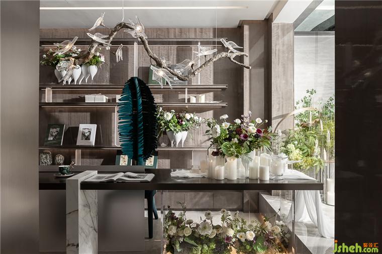 地下一層在設(shè)計(jì)上解決了讓瑣碎切割的空間互通互融,通過(guò)造景區(qū)與花藝區(qū)兩處自然光的引入,以大面積玻璃窗讓光線自上而下貫穿,再以墻體的分隔和半圍合勾勒出框景,讓人的行為動(dòng)線不受影響,但是視覺(jué)和空間序列卻多了層次感與穿透感,空間多了值得玩味之處,光影游戲其間。