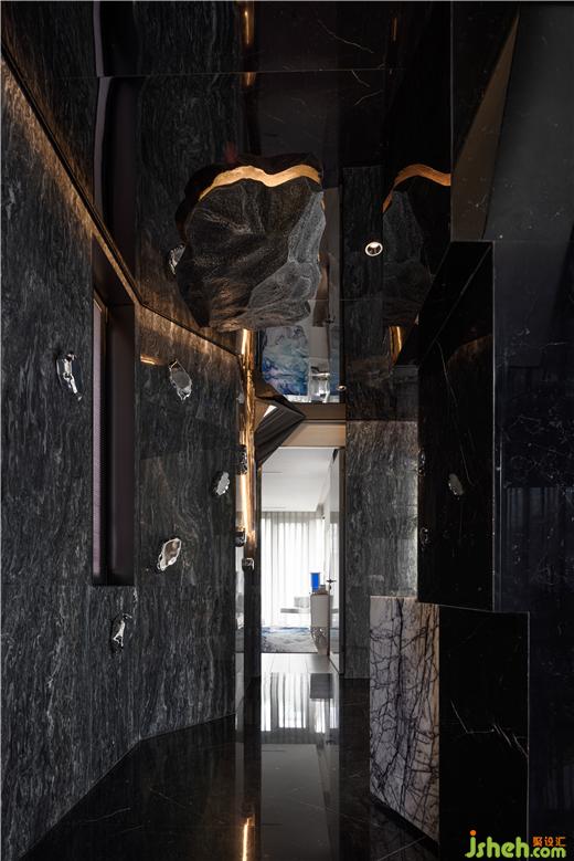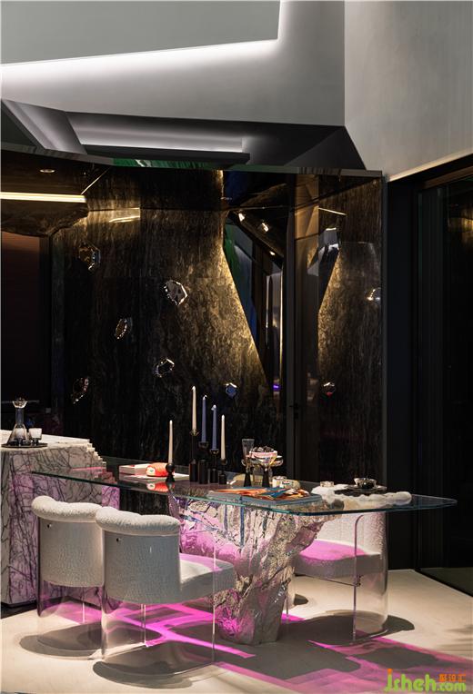 如果說客廳區(qū)是冰川、大海和極光,那餐廳區(qū)就是安寧避世的黑沙灘,黑色地面、深灰色墻面,秦皇島樣板房設(shè)計加上零散分布的剔透冰塊,走近零度曠野的氛圍感迎面而來。