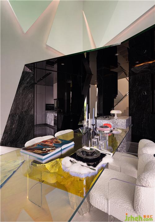 黑白交織的空間里,是空間敘述詩人的藝術(shù)狂想。秦皇島樣板房設(shè)計軒敞的挑高層架構(gòu),從天而降的極光燈具,是激蕩又縹緲的視覺沖擊,是看到歐若拉女神的狂喜悸動。藍(lán)冰塊造型沙發(fā)、沙灘極光地毯、慵懶入眠的北極熊、鉆石燈具依次出場。墻面的幾何切割造型,是結(jié)構(gòu)的破壞與重組,打破了既定框架,沖擊既定印象,是屬于解構(gòu)主義的藝術(shù)氛圍,兼俱現(xiàn)代主義簡約時尚。