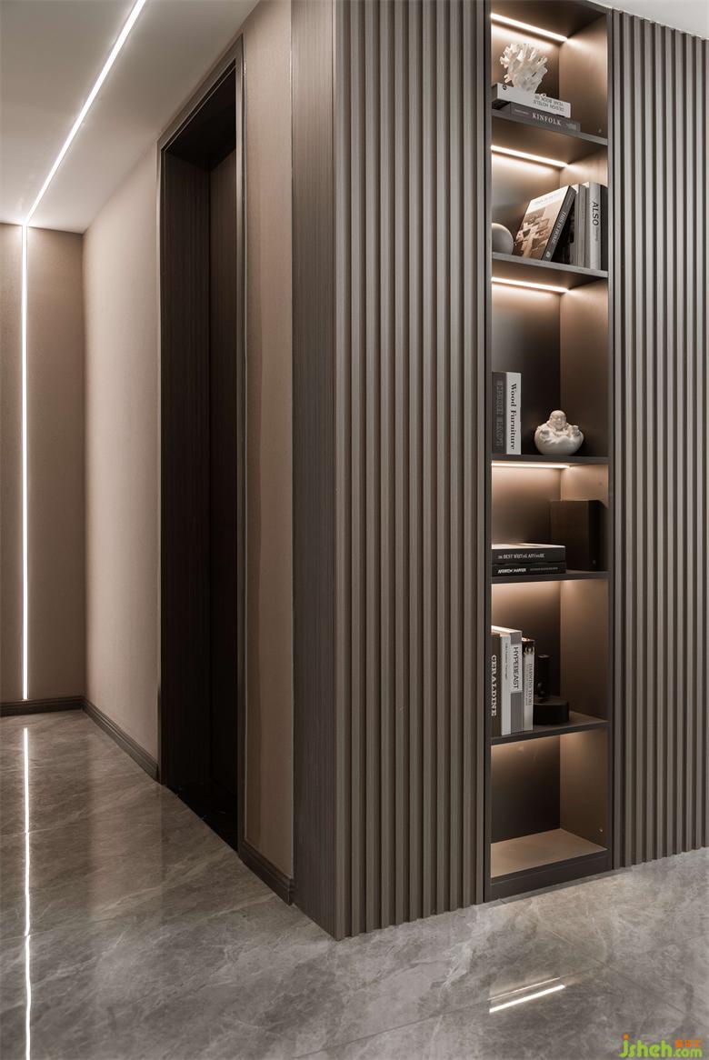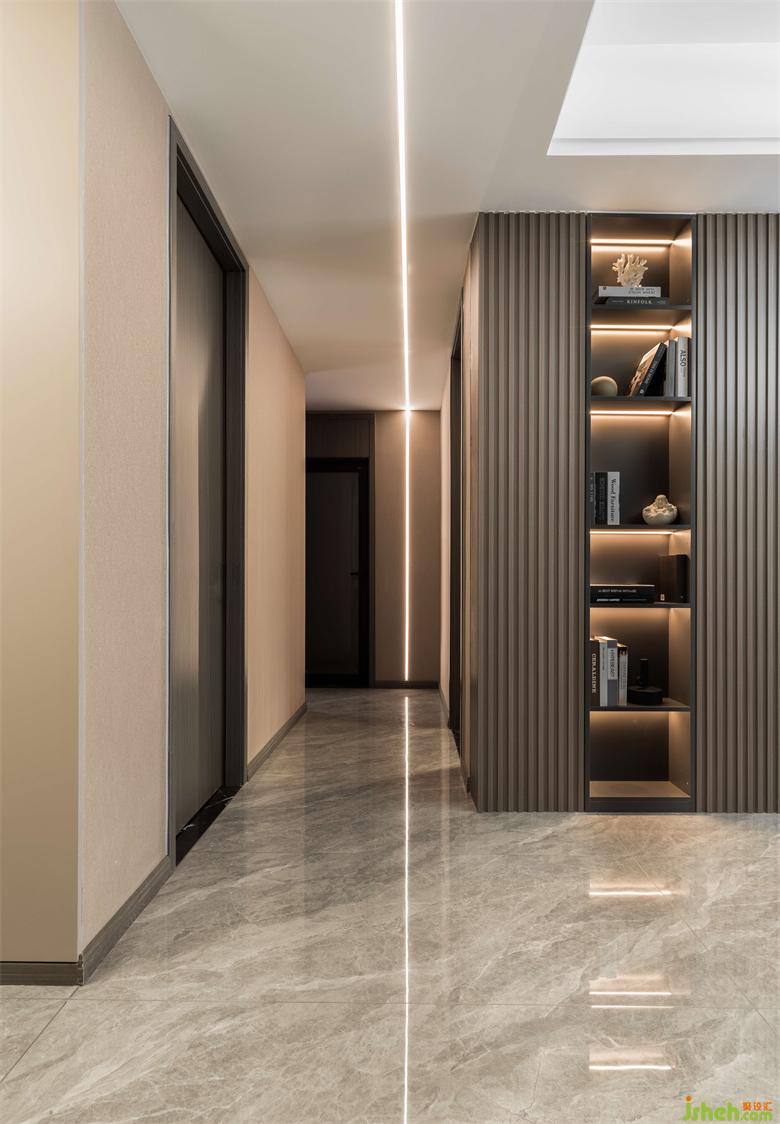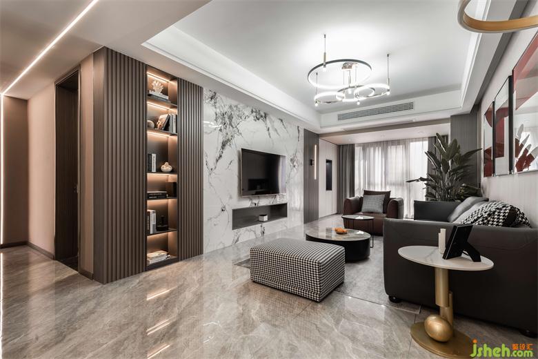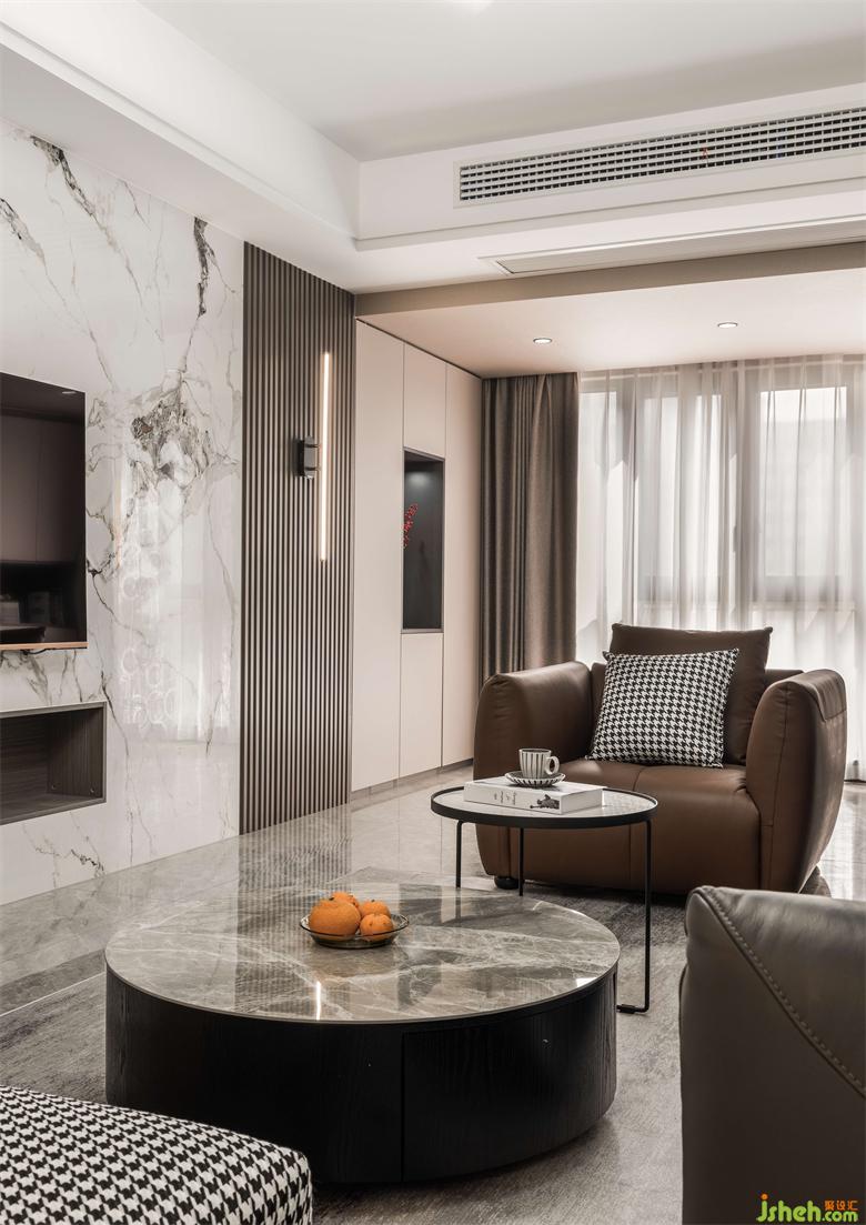 客廳是家人團(tuán)聚,招待親友的區(qū)域。用溫暖的木紋搭配高冷奢華的巖板,營(yíng)造出時(shí)尚的基調(diào)。私宅設(shè)計(jì)大地色系的墻布對(duì)墻面的包裹,顯得溫馨。