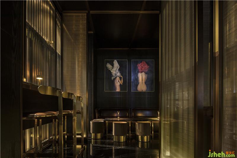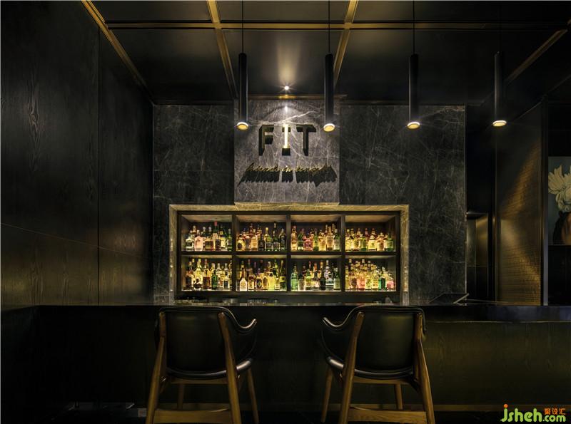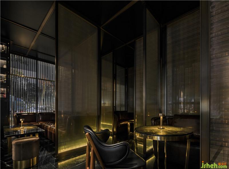 整個空間以黑色為背景,隱含著夜店的本色,也蘊含著能量聚集的概念。其間以金色作點綴彰顯威士忌酒吧的高品質(zhì)和輕奢感。