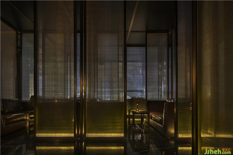 本次設(shè)計運用了不銹鋼電鍍仿銅邊框,運用了內(nèi)含金屬銅拉絲的鋼化夾絲玻璃屏風(fēng)分隔空間。這種半透明的屏風(fēng)無形之中使得整個空間形成了不同層次的透疊效果??臻g“虛”中有“實”,“實”中有“虛”,“虛虛實實”相得益彰,讓進入FITCLUB的每位客人都有種若隱若現(xiàn)的東方“朦朧美”。