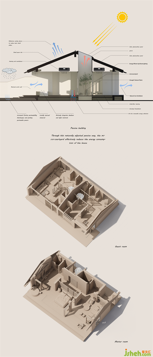 節(jié)能措施:地面架空+夯土外墻+天井內(nèi)院+雙層中空門窗系統(tǒng)