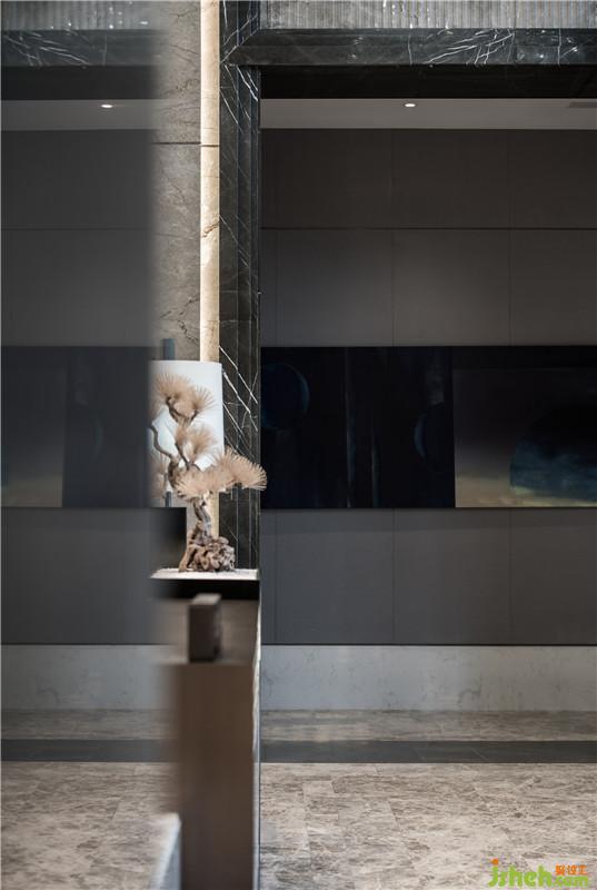 云深秋山落西風,縫是霧色半朦朧,空間整體,自然的質(zhì)感與藝術的精奢氣質(zhì)融為一體,奠定了整個空間的基調(diào)。棕色如水般流瀉,天花縱向線條向上延展,像山脈的紋理鋪展開來,木柵排布出空間的疏密節(jié)奏,大氣儼然中,亦不失自然樸質(zhì)的美學風韻。
