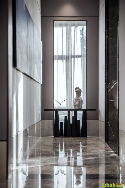 在創(chuàng)作的過程中把建筑作為一種詩意的想象,滲透抽象在這座當(dāng)代中式人文宅邸,基于【宋 · 歐陽修】《醉翁亭記》“風(fēng)霜高潔,水落而石出者,山間之四時也”的設(shè)計定位,以詩之語境,構(gòu)建當(dāng)代東方人文逸美生活典范的設(shè)計定位,并提取“風(fēng)霜”-“水落”-“石出”-“山間”四個自然元素為記憶點營造空間詩意的情感氛圍。