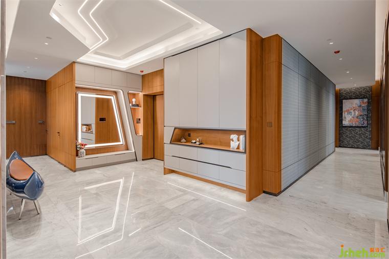 樣板房設計以空間的氣質來揣度居者的品位,入戶玄關深色木與淺杏色飾面搭配相得益彰給空間帶來沉穩(wěn)的高貴氣息。幾何線條流線造型的換鞋區(qū)和天花造型上下呼應,結合明確的比例,優(yōu)美的線條和經(jīng)典的細節(jié),增加了空間的趣味性的同時也具有收納的實用性。