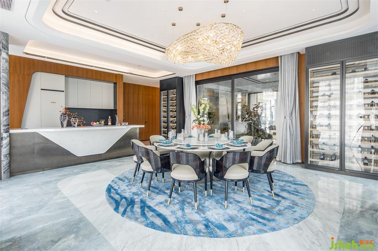 餐廳和西廚用了一體化的設計,樣板房設計讓空間的動線更加的顯而易見,中島臺設計滿足了一個西廚更高形式的功能需求。軟裝在面料、材質及色彩上與硬裝整體調性相呼應,陳設無過渡堆積元素,彰顯主人高端品味。玻璃幕墻打開建筑邊界,室內因自然強勢介入變得靈動。
