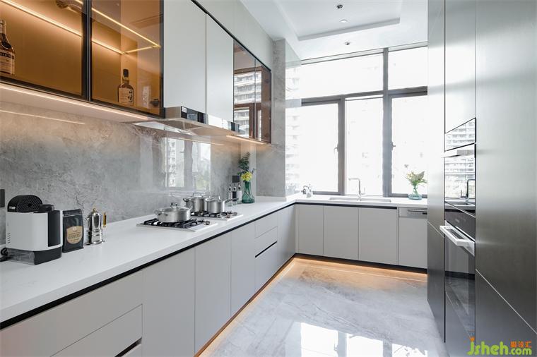 中廚配置了L型的廚柜既保證了操作面的同時也增加了很多收納功能。簡練烤漆飾面為廚房帶來干凈利落質感,暗藏內嵌的設備,樣板房設計將功能與美觀完美結合,以心思布之各得其位,由器及道,感受著食材搭配之妙趣。這是對家的具象表達,真實且幸福。