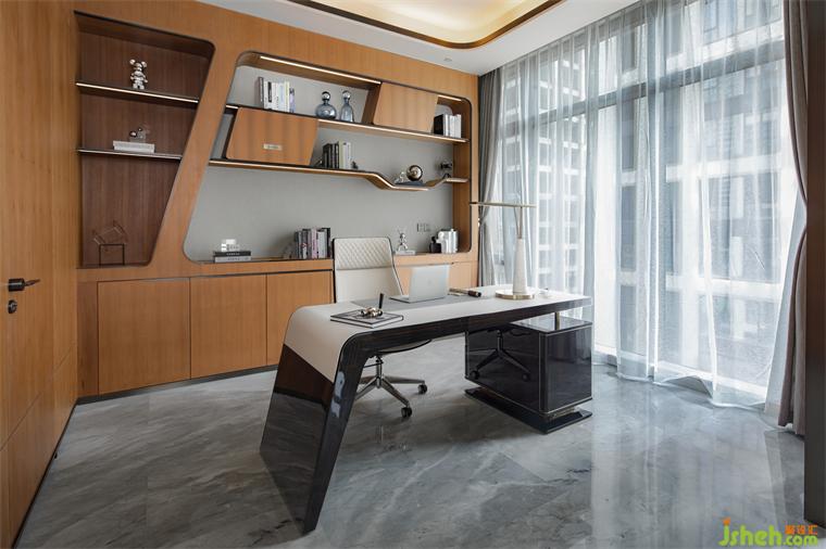 書房書柜不規(guī)則幾何元素增加一抹趣味性,即是書架也是展示柜,橫縱交錯的線條和體塊,豐富空間功能屬性的同時,賦予空間內斂而溫潤的優(yōu)雅氣質。