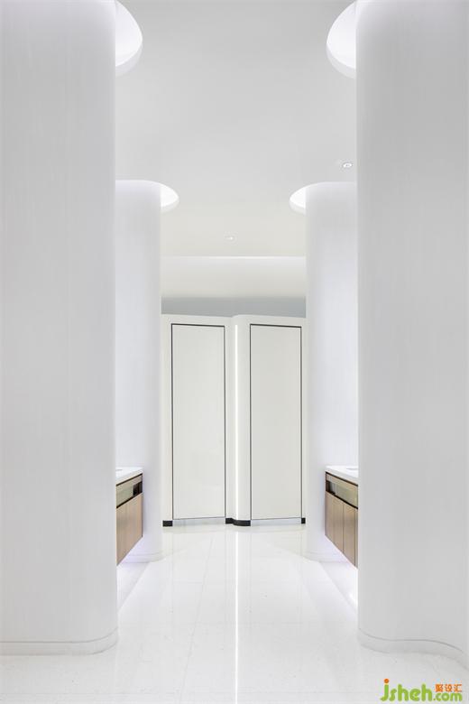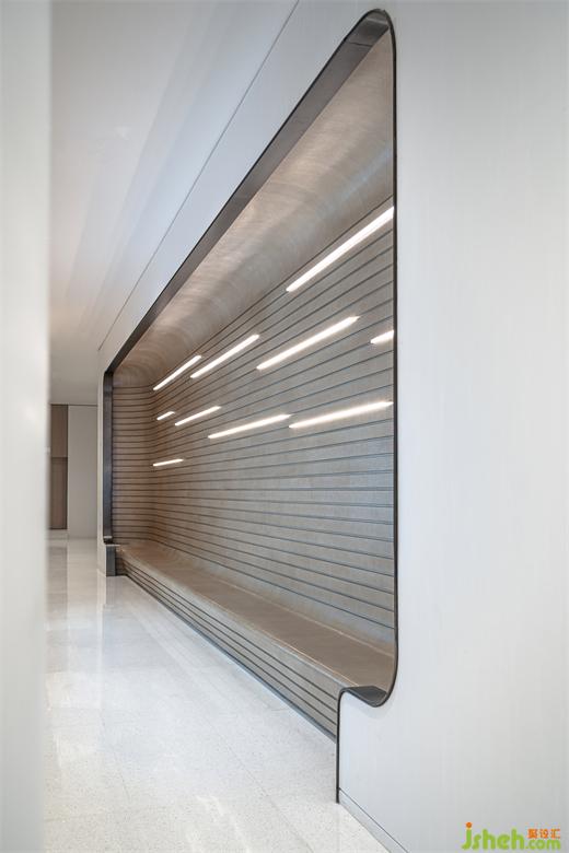 · 內(nèi)側(cè)部分,針對卷簾裝置與過道頂面的高差,設(shè)計師擯棄簡單的直線處理,采用柔和的弧線造型吊頂來呼應(yīng)空間設(shè)計語言,并設(shè)置反光LED燈槽來凸顯樓板部分的層高。