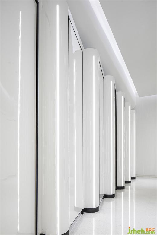 · 外側(cè)部分,設(shè)計師利用樓板外立面與卷簾裝置之間的高度差做開槽處理,內(nèi)嵌反光LED燈槽,利用有層次的流線造型,營造出空間的層次感;