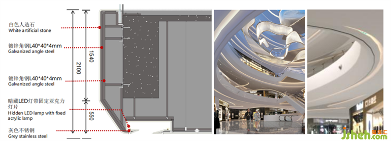 為了消解防火卷簾時位置過于低帶來的壓抑感,購物廣場設(shè)計師通過“局部吊頂”進行了再設(shè)計: