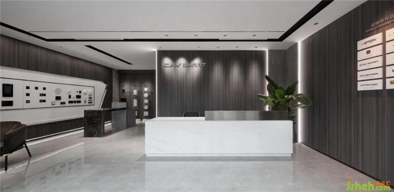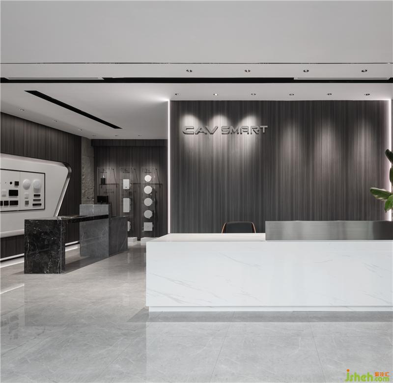 首先最重要的開始,應該是LOGO背景墻。兩邊暗藏燈帶,從地面一直延伸至天花,起到延伸感。從前臺一步步牽引,開闊明亮,裝修設計摒棄主燈帶來的壓抑,在沒有主燈的空間里,信息流動通透自然。黑色燈槽平行交錯,科技時尚感逐步放射出來。