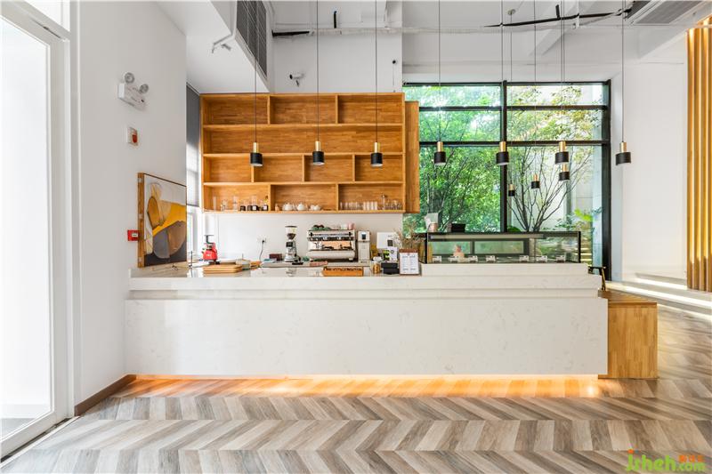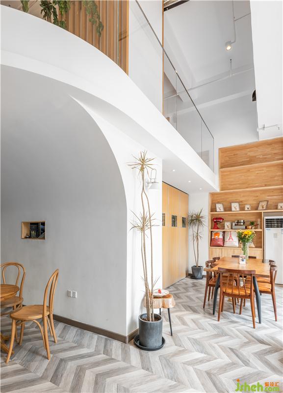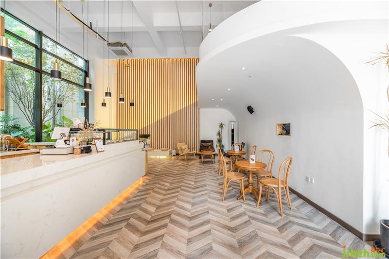 整個空間墻面、地板,用木材作為設計的主要材料,但地面選擇納入顏色斑駁的木質(zhì)幾何貼片,更具層次感和裝飾性。墻面選擇涂刷白墻為裝修設計,吧臺臺面使用光潔的大理石,干凈敞亮。