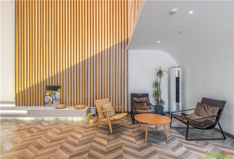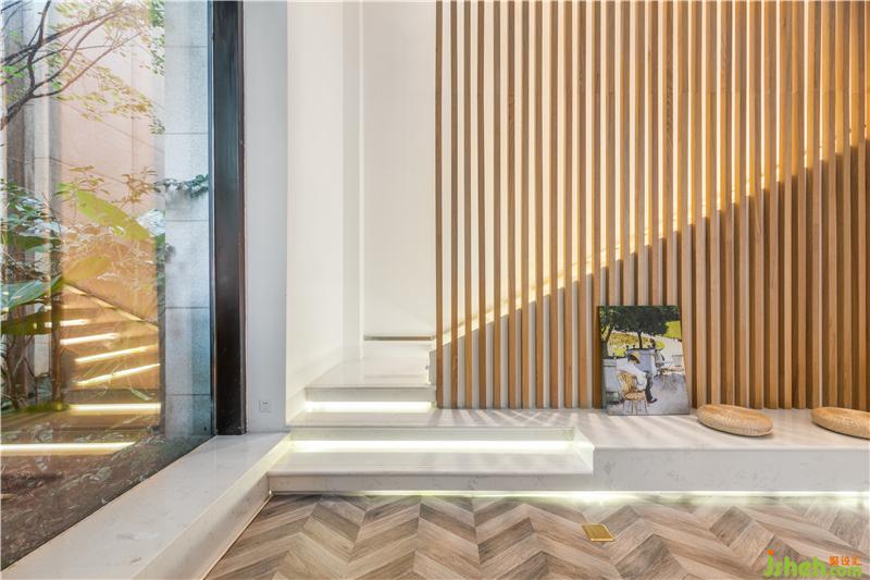 一樓通向二樓的樓梯安置在最內(nèi)側(cè)靠墻位子,不與其他功能互相干擾。同時用木質(zhì)豎條格柵進行遮擋,既增加了裝飾效果,又使空間整體性更嚴密。階梯嵌入燈帶,人行在上面行走時,明與暗、動與靜幾何分割層次感更加強烈。