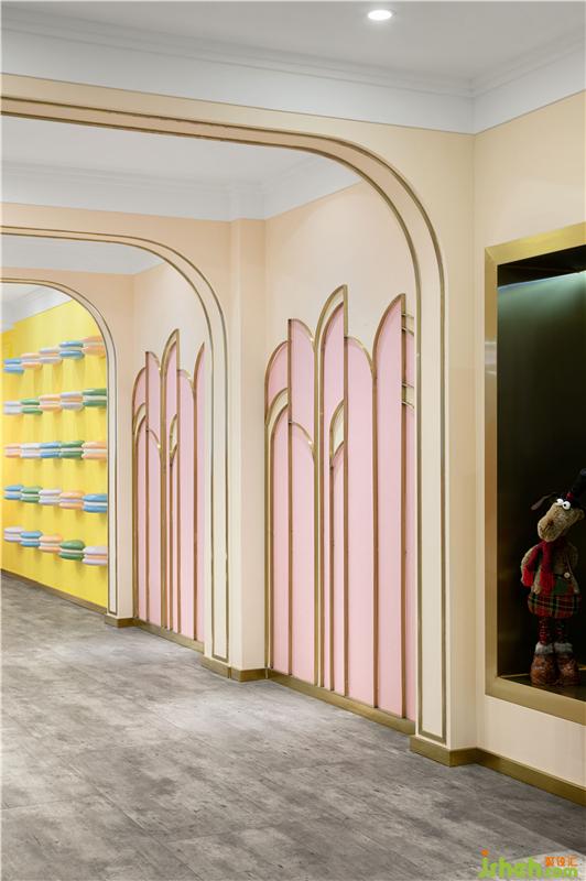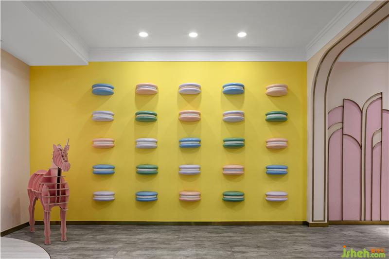 走廊的裝修設計采取了無主燈設計。由于一般走廊上方都有梁,在視覺上比較壓抑,為了對空間作更好的過度,把整個走廊做全吊頂無主燈的規(guī)劃,這樣在提供照明的同時又能保持走廊空間的簡潔大方視覺感。而且,黃色+粉色的搭配,青春洋溢的氣息撲面而來,旁邊馬卡龍的裝飾尤顯可愛,有沒有觸發(fā)你的少女心?趕緊拍照打卡!