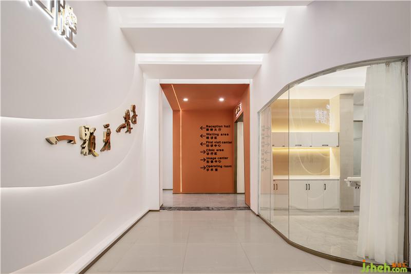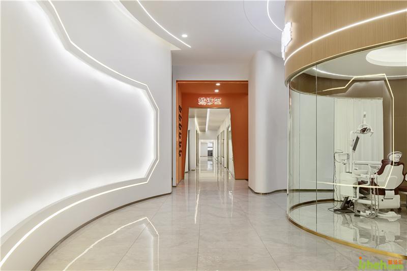 玻璃墻壁讓走廊更具大空間感,不致于狹隘窘迫。獨立半封閉式的診療室既符合醫(yī)療私密特殊性,又滿足設計美觀實用性,健康和美學不沖突。走廊一側的背景墻用乳白色石膏板簡單造型,一側切割出幾厘米的厚度,增加局部空間層次豐富飽滿,預留出的企業(yè)slogan的位置,傳達著友好溫馨的信息。