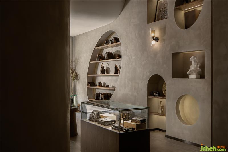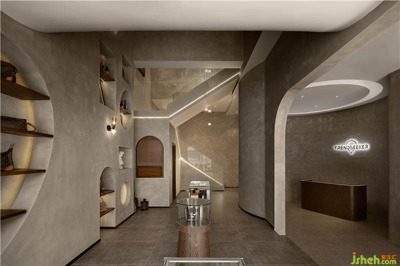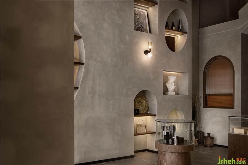 墻面涂刷低飽和高級灰調(diào)質(zhì)感漆,以柔和、層次自然的紋理,很好的收斂了室外的浮光動(dòng)態(tài),店鋪設(shè)計(jì)讓人即刻開啟一段沉浸式尋寶體驗(yàn)。而弧型隔斷、拱門的巧思可謂一舉多得,從功能上弱化了原始柱梁的突兀;也營造了視覺沖擊力的豐滿;同時(shí)造就了懷舊的工業(yè)氣息。當(dāng)人穿行其間,仿若穿行于時(shí)間軸的軌跡,以至于舒適的體感鏈接到更強(qiáng)的購物欲。