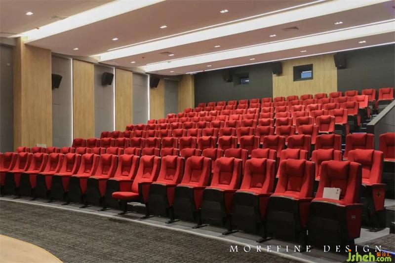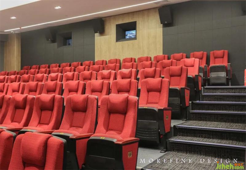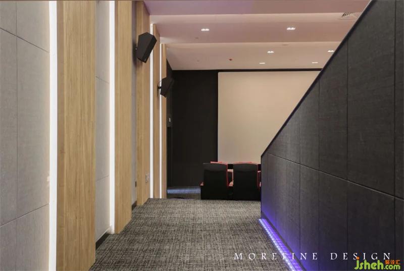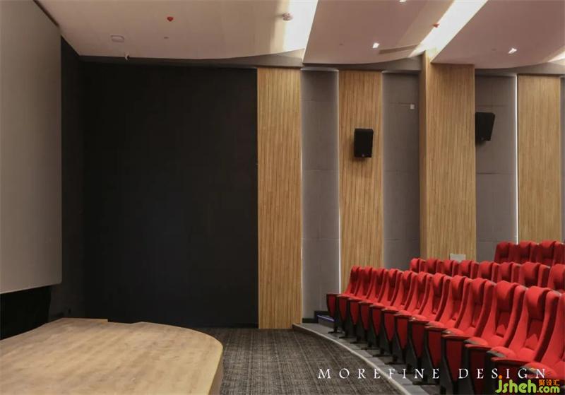 通過理性嫻熟的色彩、材料把控,能快速識別各個功能區(qū)的區(qū)位。大堂天花板的吊頂設(shè)計靈感源自舞臺燈光造型,營造出沉浸式體驗,空間層疊漸進,頂部流線曲形環(huán)繞,讓人猶如置身于張弛有度的舞臺之間,使整個空間更具藝術(shù)感。