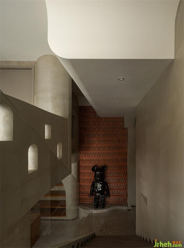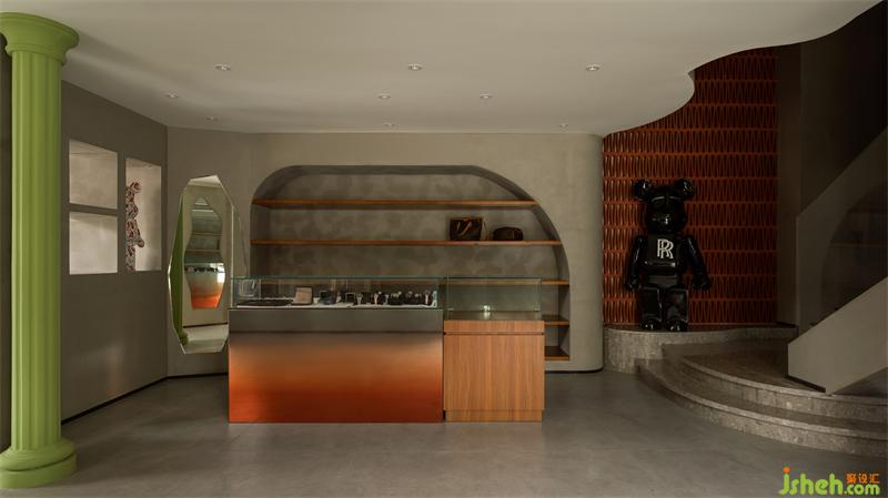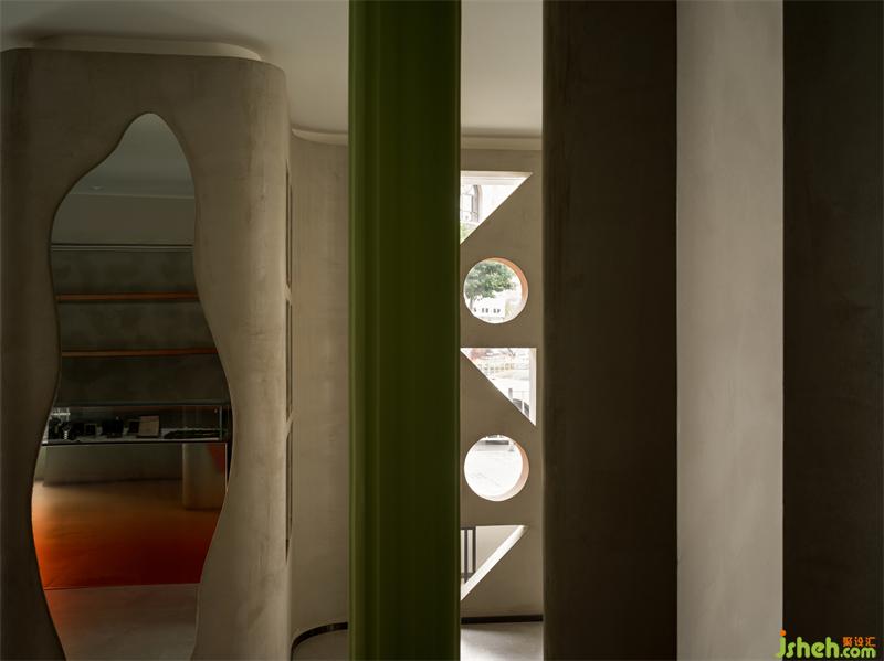 隔離了市儈的招搖,驛動的心被帶入室內(nèi)。店鋪設(shè)計建筑梁結(jié)構(gòu)與不同樓板之間的關(guān)系,與幾何構(gòu)造相互滲透,讓復(fù)雜性聚合成一個整體。避免了機械的乖張,故意營造出讓人詫異的破壞性影劇場景,特意手工打造的好幾種斑駁藝術(shù)圖案的漆面,在四季白晝的光線中漸隱漸顯,與厚重的幾何體塊幻化交織,迭代出飄渺的神秘效應(yīng)。