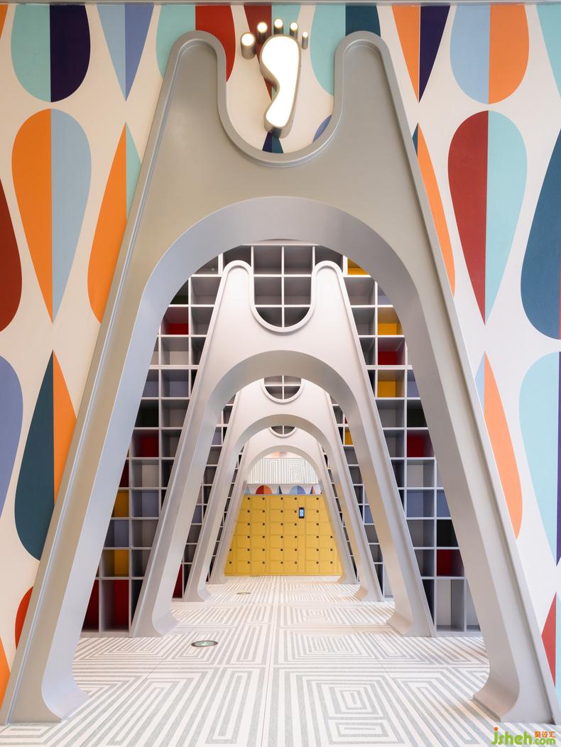 閩南語(yǔ)中“奧蘇阿|aosua”的意思是后山,童年記憶里的那座無(wú)名之地,隨著時(shí)間,逐漸在消失和被淡忘……層疊視錯(cuò)的入口仿佛時(shí)空洞窟,夾雜著光影下的反差,重啟一場(chǎng)想象力的漫游。室內(nèi)設(shè)計(jì)師“山”的輪廓賦形于換鞋區(qū)大小尺度的空間界面和家具模塊,兒童樂(lè)園設(shè)計(jì)以抽象的色彩及圖案拼接自然記憶,倒掛其間的絨草裝置更添注超現(xiàn)實(shí)的意趣。