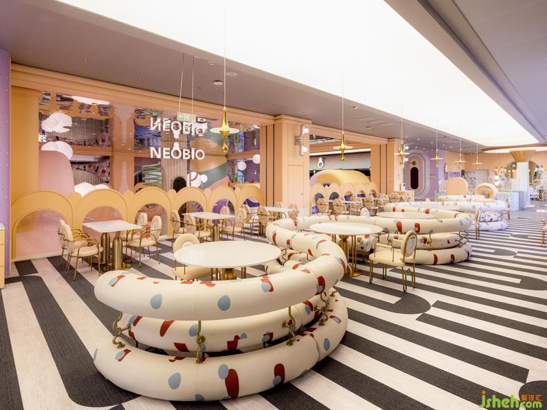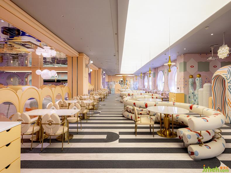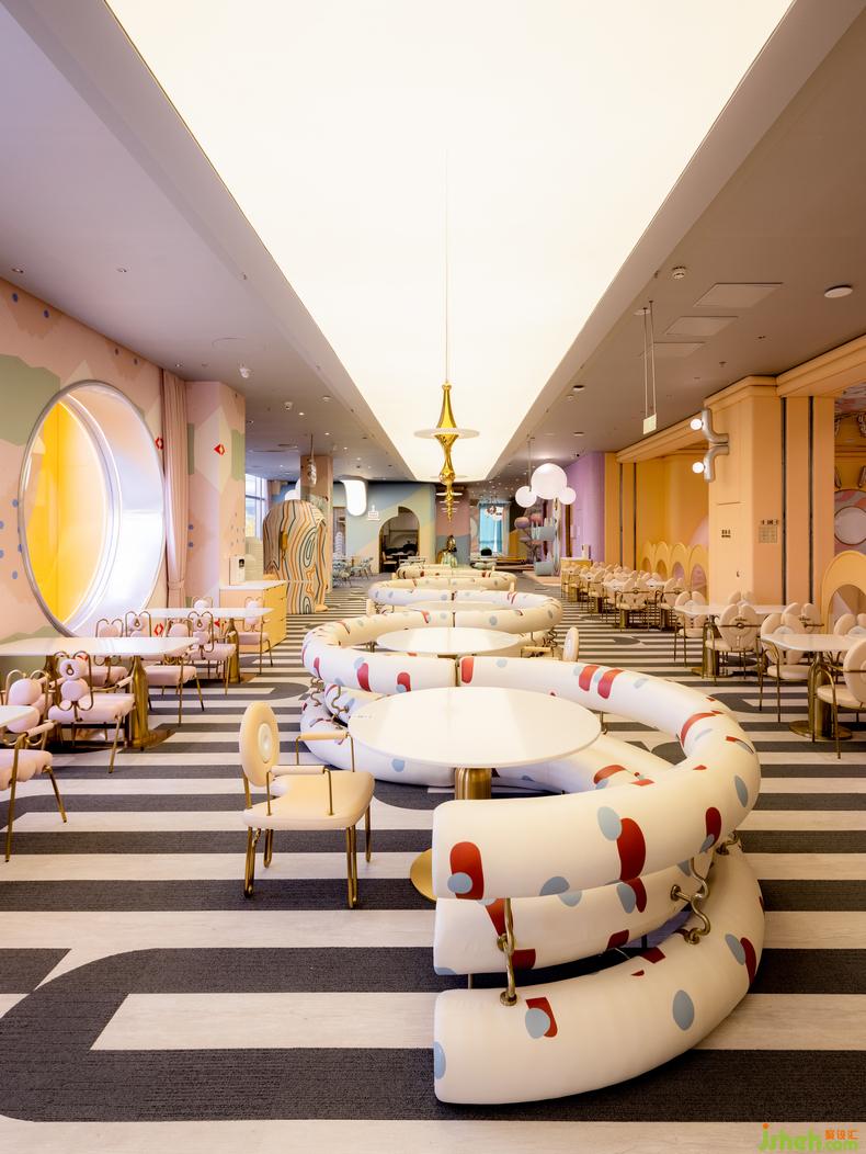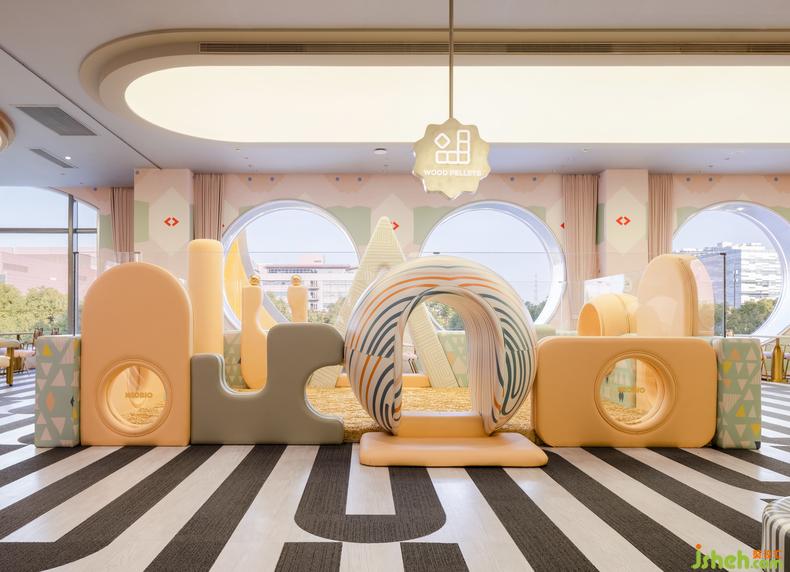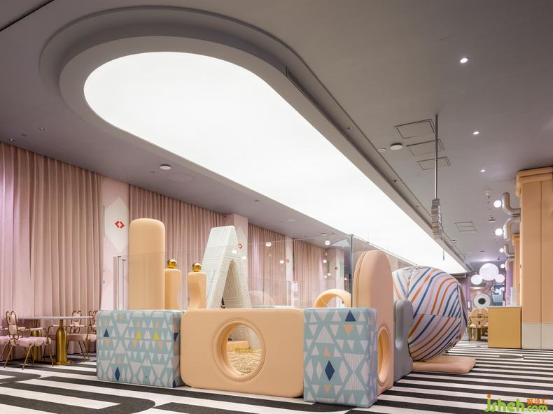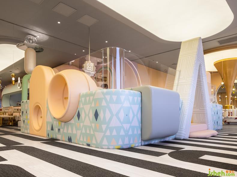 自由動線串聯(lián)的空間序列中,多維度視角的關(guān)注點(diǎn)落在個體的人。兒童樂園設(shè)計(jì)記憶的灰度注入低飽和、弱對比的用色方案,吸納自然的溫暖肌理。照明亦多以白色燈膜貼近自然光的方式營造大面積漫反射的舒適光環(huán)境。