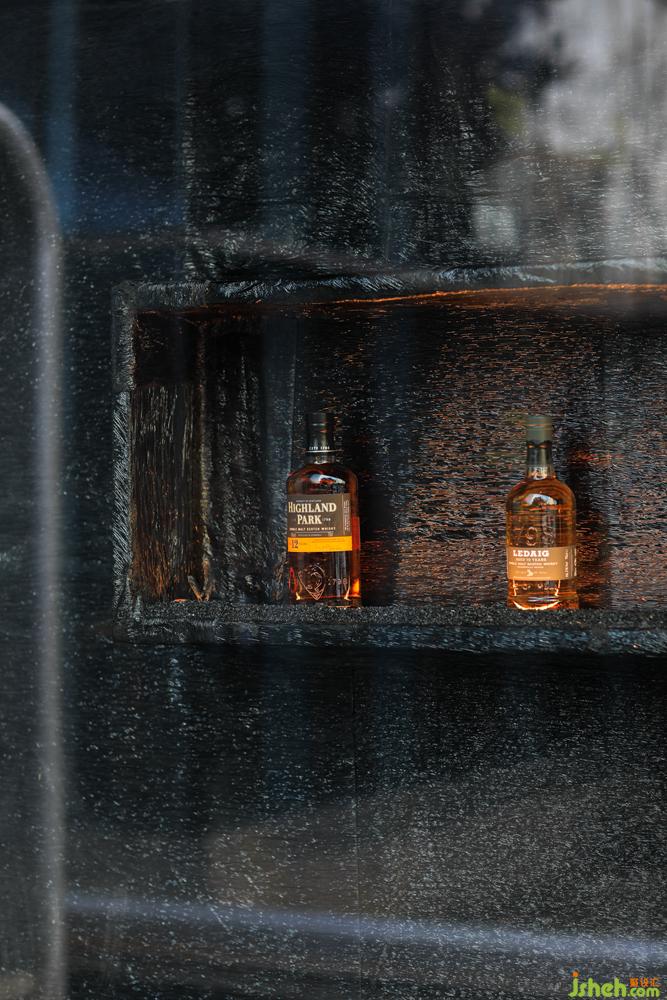 入口處左邊的黑色集裝箱建筑使用油布包裹,與主體的建筑保持距離,酒吧設(shè)計(jì)這是一種時(shí)刻被運(yùn)輸移動(dòng)的狀態(tài).集裝箱內(nèi)部有一排酒柜,暗示著whisky從各個(gè)國(guó)家被運(yùn)輸送達(dá),而后給人帶來(lái)愉悅和歡樂(lè).這個(gè)過(guò)程更像是大麥芽經(jīng)過(guò)時(shí)間的催化,在橡木桶中轉(zhuǎn)變成whisky一樣的有趣.