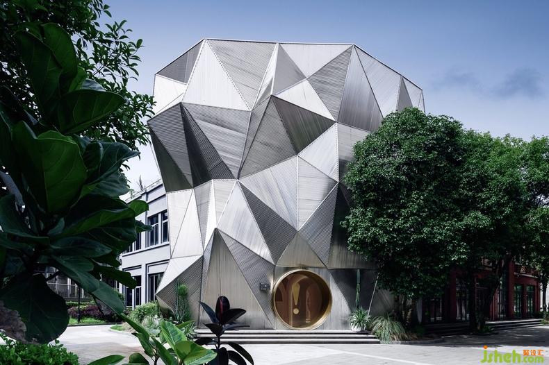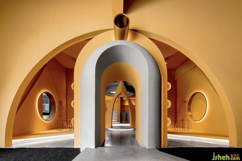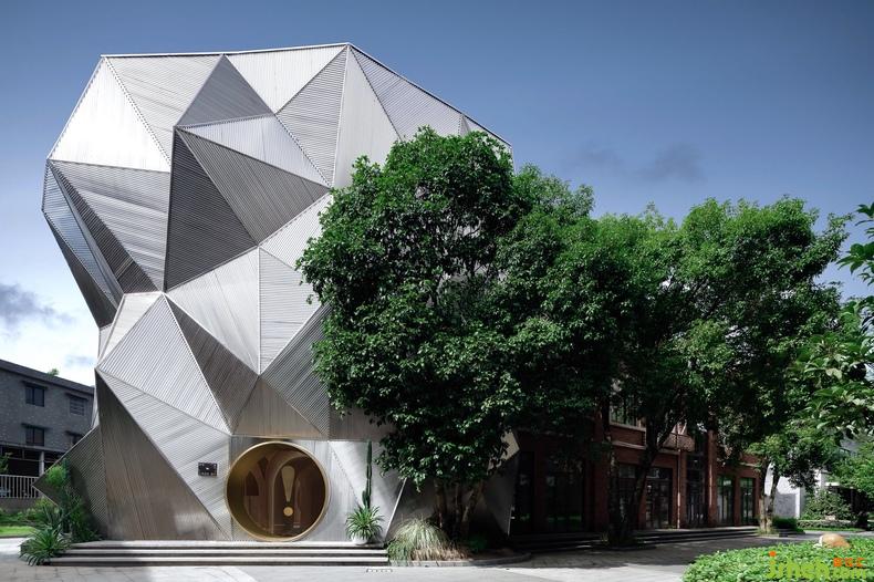以瓦楞堆疊的懸崖作為外立面造型設計的概念,奇異的視覺體驗涉及到復雜的工藝結構——不銹鋼瓦楞板的收邊與銜接,在建造過程中設計師不斷思考和改進工藝節(jié)點與材料的處理,最終完成整體效果。懸崖洞口修飾巨大的驚嘆號,牽引人們探索未知的世界。而一切先知的視覺畫面都成為怪誕異形空間的索引。