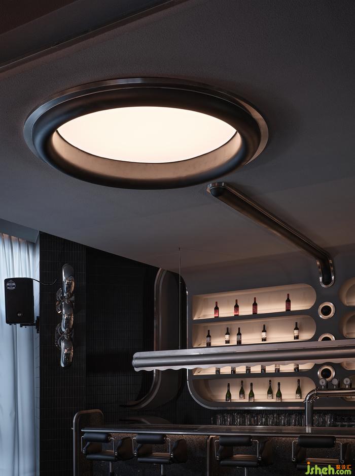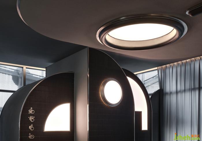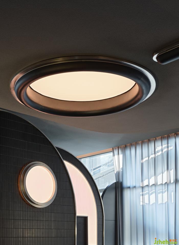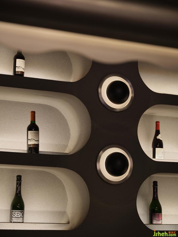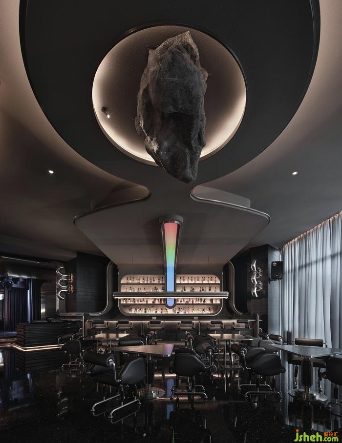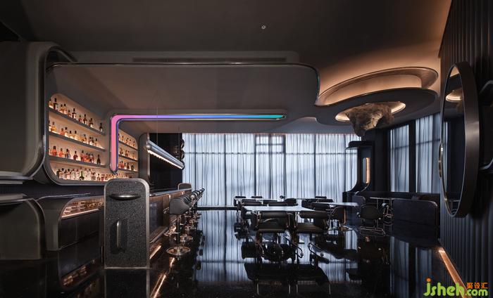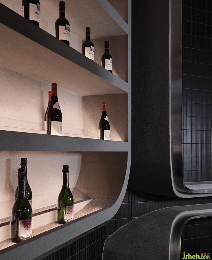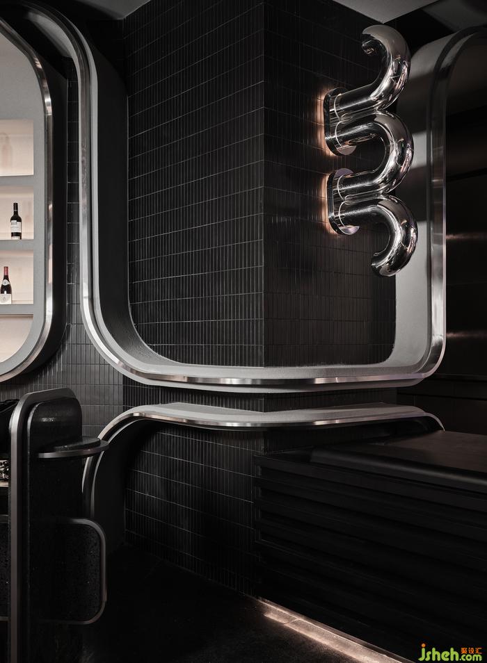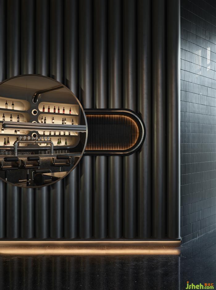 從舞臺(tái)吧延續(xù)至酒吧空間,天花和墻體界面嵌入隱潤(rùn)的光源,大面積的漫反射蘊(yùn)生微妙氛圍,餐廳設(shè)計(jì)鏈接或向外凝望或向內(nèi)探索的視線互動(dòng)和社交維度。色階過渡的光帶連通天花與酒架,而懸垂的粗糲原石裝置自帶物質(zhì)性的美學(xué)意義,微縮凝結(jié)為“點(diǎn)石成金”的敘事藝術(shù)。