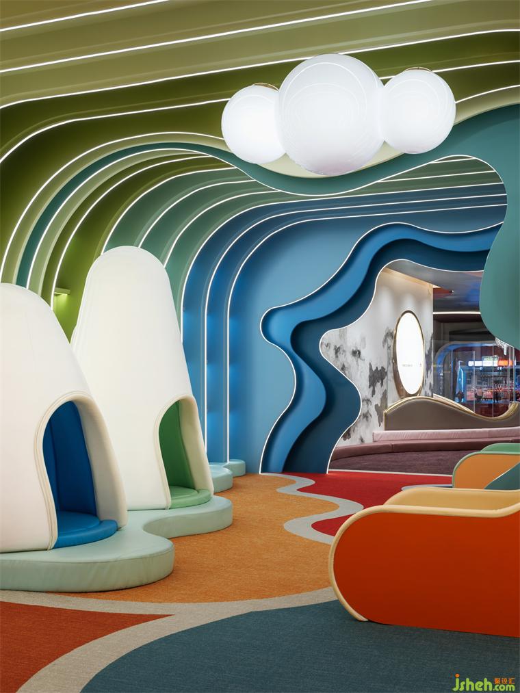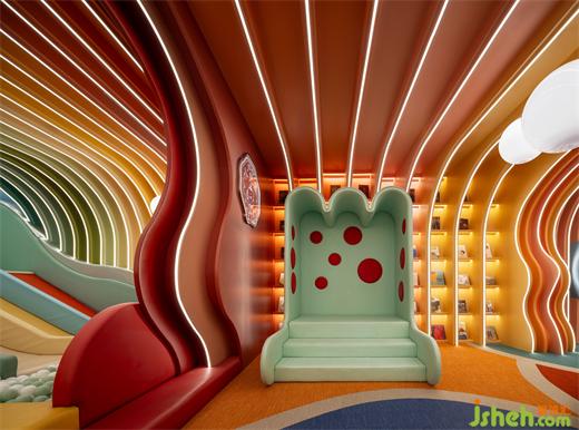 暗喻精神與文化傳遞的圖書區(qū),以本真意識的山水夢境觸動(dòng)感知的飽滿張力,在七彩光譜遞進(jìn)渲染的層疊序幕中,書籍作為人類文明的記錄載體,釋放新舊記憶的交匯信息。