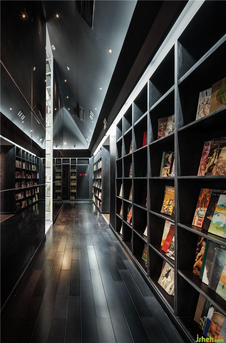 白色圣殿的背后是一圈環(huán)形廊道,黑鏡、黑書架、黑吊頂、黑地板,仿佛就要沉到夢(mèng)深處的神秘。在這個(gè)黑色的畫廊中,誰知道?不曾醒來也不曾睡去。